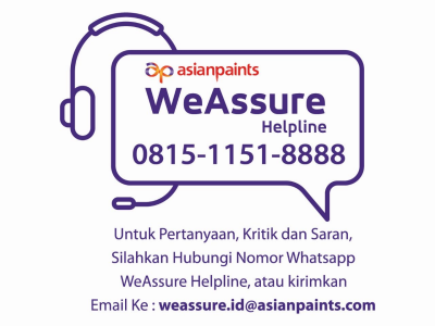 Jika Anda memiliki saran, kritik atau pertanyaan mengenai produk dan layanan PT Asian Paints Indonesia, Silahkan Hubungi Nomor Bebas Pulsa di nomor 0815 1151 8888 atau kirimkan Email Ke alamat weassure.id@asianpaints.com. Kami siap memberikan penjelasan lebih lanjut mengenai pertanyaan dari Anda.